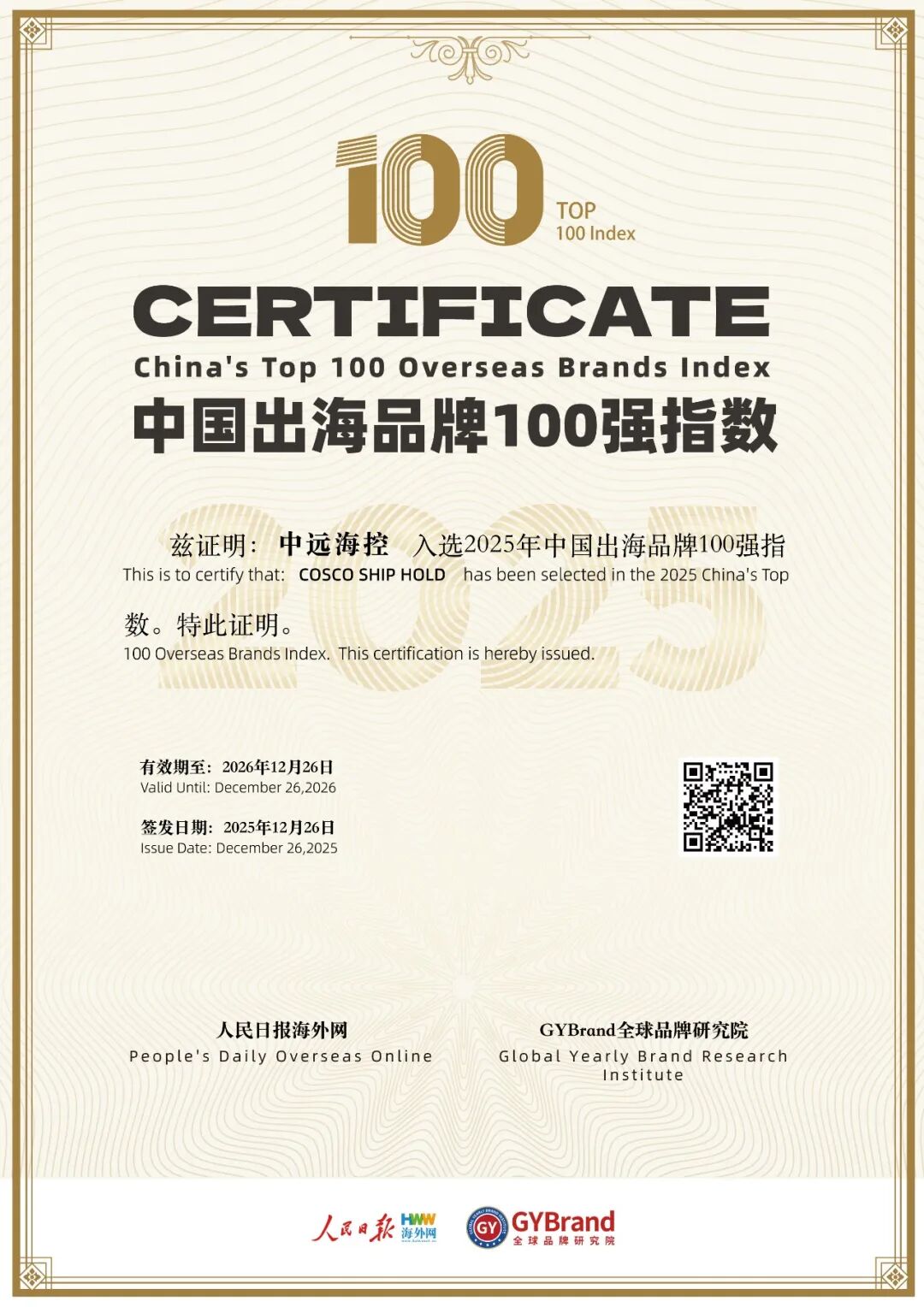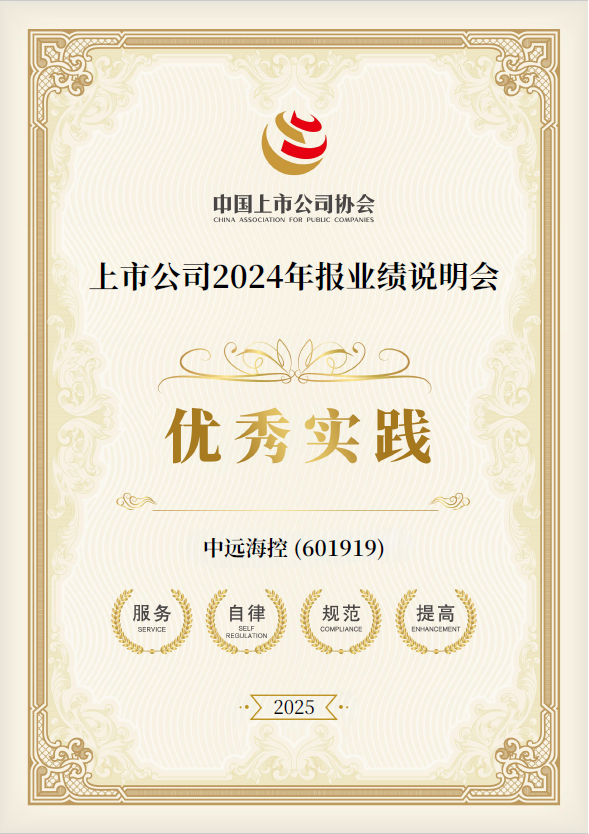 12月26日,由人民日报海外网与中华环保联合会联合主办的第三届中国品牌形象海外传播论坛公布《2025年中国出海品牌100强指数》,中远海控连续两年光荣入选。 今年以来,中远海控全球航线网络越织越密,运力结构得到进一步优化。为更好的赋能千行百业的客户,发布了全球拖车产品、全球铁路产品、全球仓储产品,实现全球海陆运输网络高效衔接,与全球合作伙伴共同创新发展。 荣获中国上市公司协会 年度业绩说明会优秀实践奖 近期,经中国上市公司协会依托投资者关系管理专业委员会,联合专家代表开展评选,中远海控荣获年度业绩说明会优秀实践奖。 中远海控始终高度重视业绩说明会,努力与投资者做好沟通,为投资者更好地评估公司长期投资价值提供参考,推动形成理性投资、价值投资、长期投资的良好市场氛围。 入选第十九届上市公司 价值评选ESG百强 近期,由证券时报主办的“第十九届上市公司价值论坛暨 2025 新质生产力巡礼宜宾行” 在四川省宜宾市举行,会上揭晓了 “第十九届上市公司价值评选” 榜单,中远海控荣获上市公司ESG百强。 作为具有高度社会责任感的航运企业,中远海控持续推动绿色低碳的可持续发展。今年以来,中远海控通过船队发展绿色化、船舶燃料清洁化、全链运营智能化等措施,为实现中长期脱碳目标打下坚实基础。 未来,中远海控将继续加强全球通道网络布局,深耕数字化供应链,秉持绿色发展理念,深化社会责任担当,引领行业向更高质量、更可持续的方向迈进。