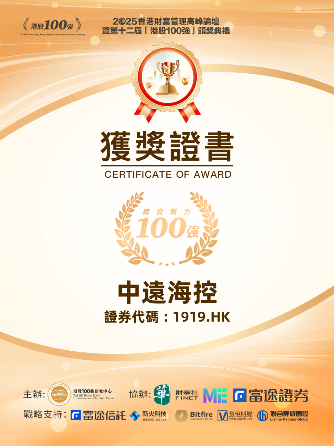 中远海控凭借营收利润稳健增长、现金流充足的财务表现、全球布局的航运港口网络与全产业链协同优势,以及数智化创新与绿色转型的突出成果,在其他“港股 100 强”核心评选维度上全面达标,因此入选“综合实力 100 强”。
